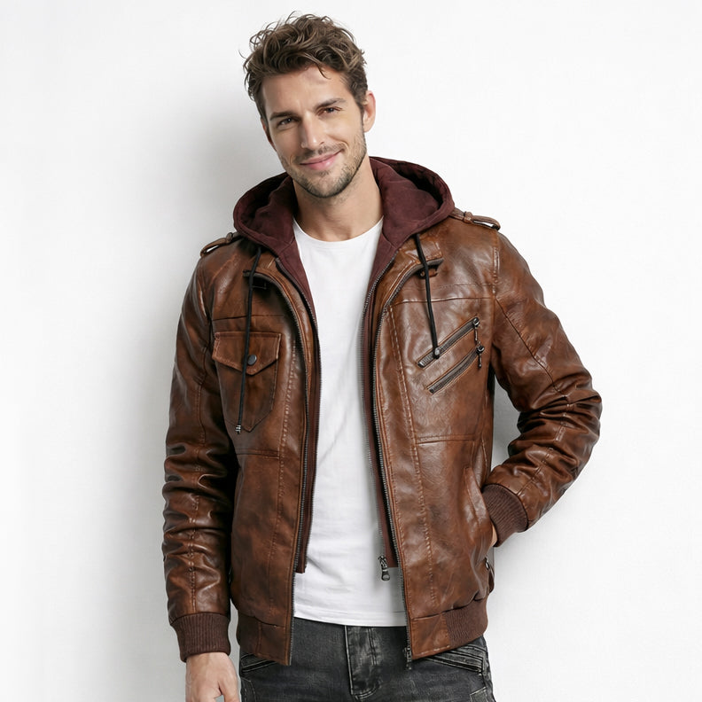 Lernen Sie unsere Motorrad-Lederjacke mit Reißverschluss vorne und Kapuze kennen: Wenn Sie Lederjacken lieben, werden Sie diese klassische Motorrad-Lederjacke mit Reißverschluss vorne besonders lieben! Sie ist elegant, atemberaubend und äußerst bequem.